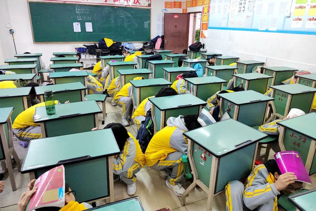 警报声响起,同学们双手紧紧抱头,迅速且敏捷地躲到课桌下方,利用桌椅等坚固物体构建起一道临时的安全屏障,以最大程度降低地震可能带来的伤害。