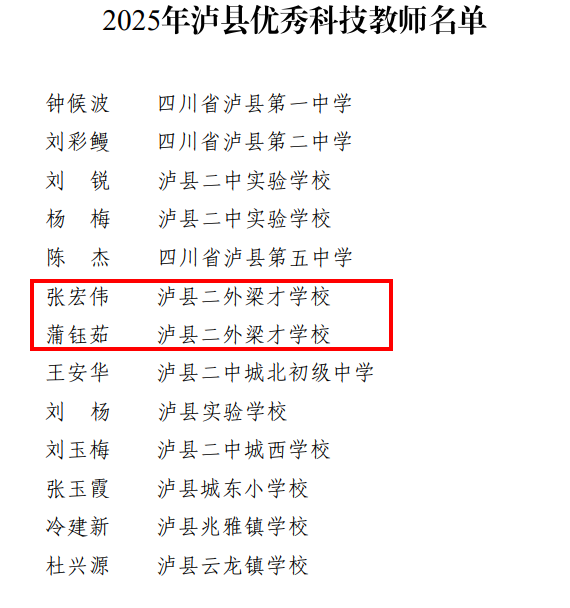 近日,泸县教育和体育局公布了2025年泸县优秀科技教师的表扬名单,泸二外教师张宏伟、蒲钰茹获评泸县优秀科技教师,特此祝贺!