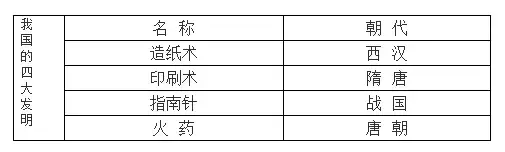 将教学内容以表格形式展现出来的板书形式。如小学历史《四大发明》一课,课文层次清楚,四部分内容表达方式相仿,教师可采用表格式板书,边讲边填写,既节约时间,又可提高教学效果。